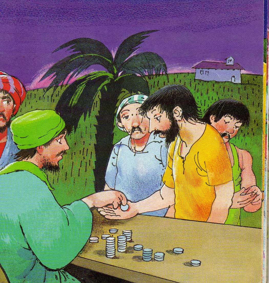 De mannen die maar kort gewerkt hebben, zijn dus het eerst aan de beurt. Zij krijgen het normale loon voor een dag werken. De mannen die de hele dag gewerkt hebben, zijn het laatst aan de beurt. Zij denken: Wij zullen dan wel meer krijgen. Maar ook zij krijgen het normale loon voor een dag werken. Met het geld in hun hand komen ze bij de eigenaar van de wijngaard. Ze zeggen: ‘Het is niet eerlijk! Die anderen hebben maar één uur gewerkt. Wij hebben de hele dag hard gewerkt in de hete zon. En nu krijgen zij evenveel als wij!’
